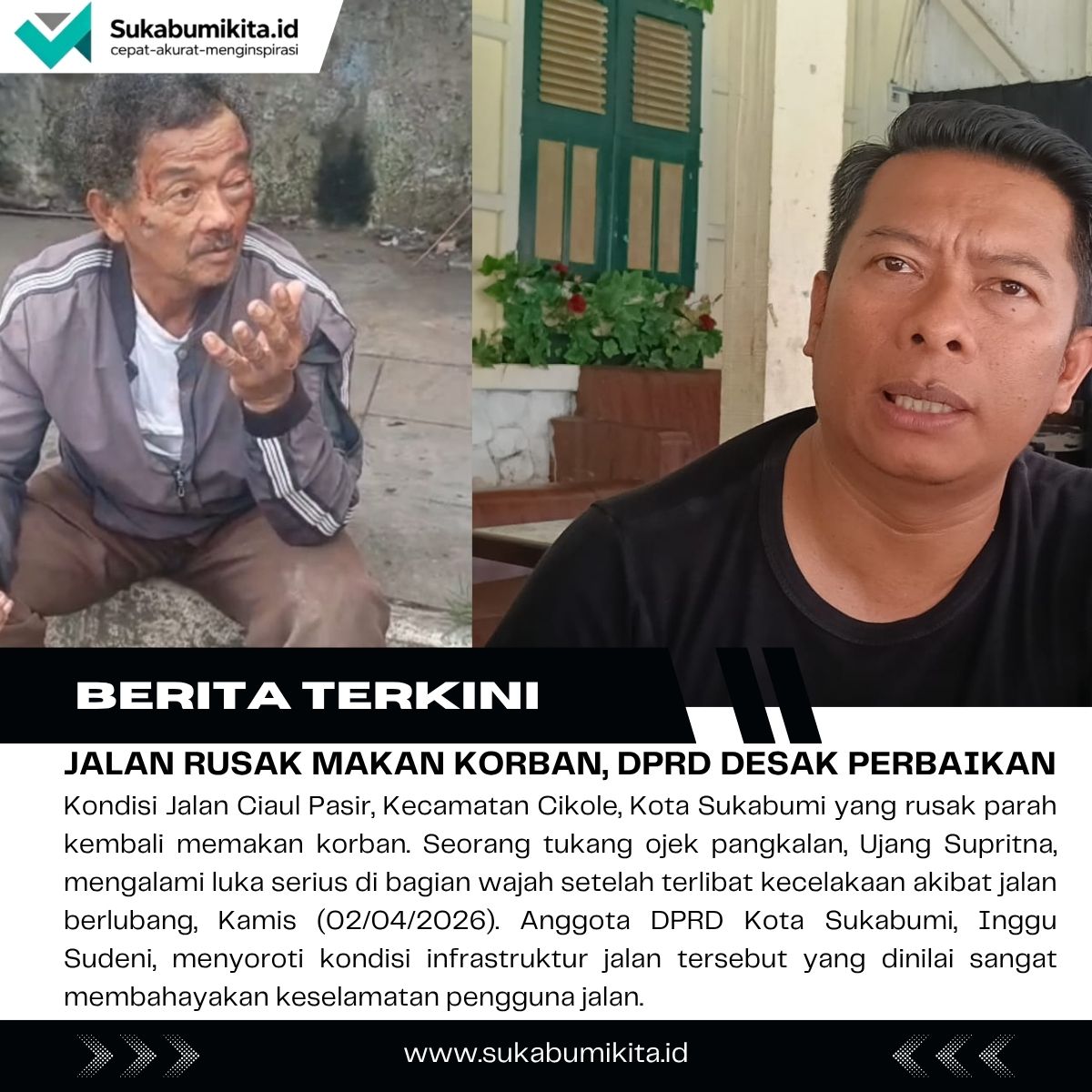 SUKABUMIKITA.ID – Kondisi jalan rusak dan berlubang di kawasan Ciaul Pasir, Kecamatan Cikole, Kota Sukabumi, kembali memakan korban. Kali ini, seorang lansia bernama Ujang Supriatna (69), yang akrab disapa Mang Ukri, mengalami luka serius setelah terjatuh dari sepeda motor di depan SMPN 15 Kota Sukabumi.