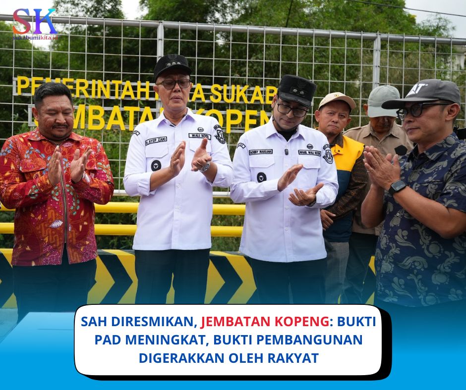 “Alhamdulillah, tahun ini pendapatan asli daerah kita meningkat. Karena itu, kita bisa mulai membangun daerah ini dengan lebih cepat. Jembatan Kopeng ini menjadi pembangunan pertama yang bersumber dari PAD, diikuti pembangunan Gedung Dekranasda dan Gapura Pintu Masuk Kota Sukabumi,” ujar Ayep Zaki.