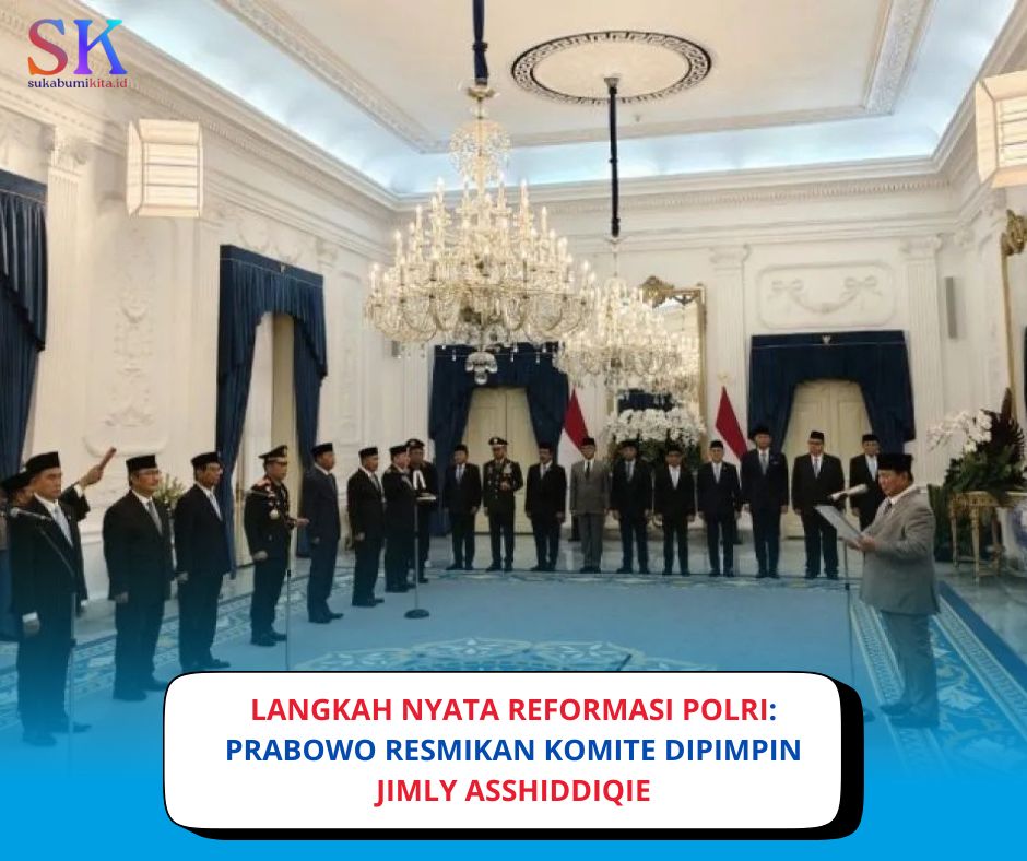 SUKABUMIKITA.ID – Presiden Prabowo Subianto secara resmi melantik sepuluh anggota Komite Reformasi Kepolisian Negara Republik Indonesia (Komite Reformasi Polri) di Istana Merdeka, Jakarta, Jumat (07/11/2025) sore. Komite ini diketuai oleh Ketua Mahkamah Konstitusi periode 2003–2008, Jimly Asshiddiqie, yang juga merangkap sebagai anggota.