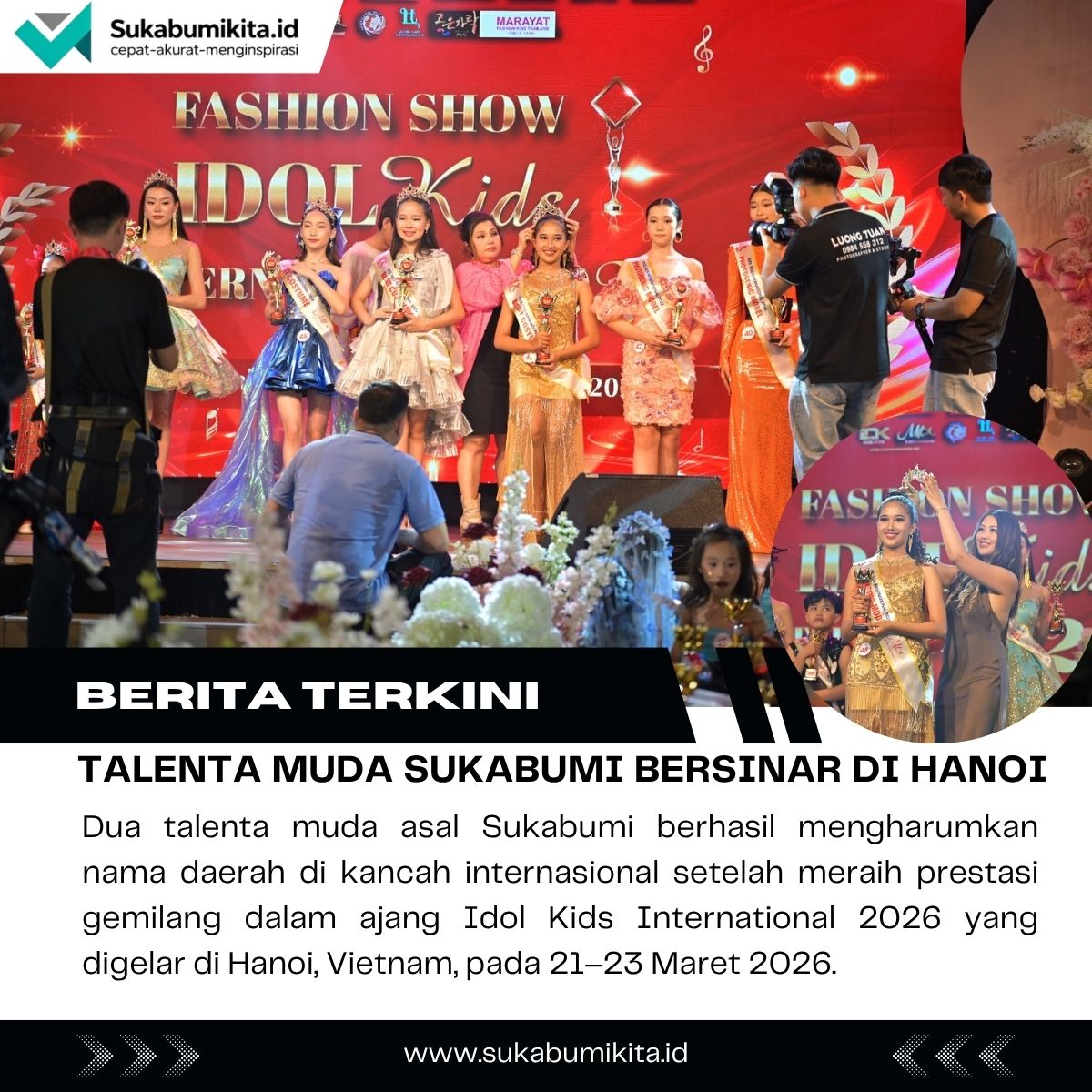 SUKABUMIKITA.ID – Dua talenta muda asal Sukabumi berhasil mengharumkan nama daerah di kancah internasional setelah meraih prestasi gemilang dalam ajang Idol Kids International 2026 yang digelar di Hanoi, Vietnam, pada 21–23 Maret 2026.