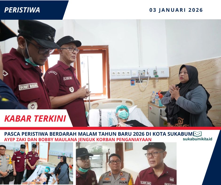 SUKABUMIKITA.ID — Wali Kota Sukabumi Ayep Zaki bersama Wakil Wali Kota Sukabumi Bobby Maulana membesuk langsung para korban penganiayaan yang tengah menjalani perawatan di Rumah Sakit Umum Daerah (RSUD) R. Syamsudin SH, Kota Sukabumi. Kunjungan tersebut dilakukan menyusul peristiwa berdarah yang terjadi pada malam pergantian tahun dan mengakibatkan empat orang mengalami luka serius.